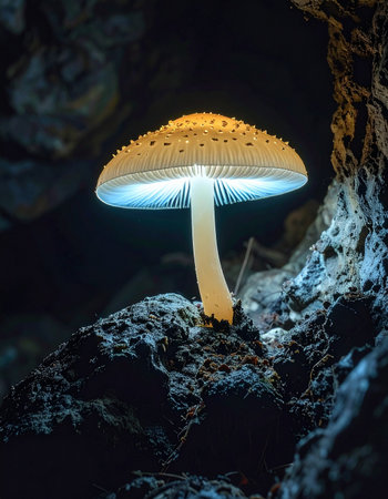 Deep within an enchanted forest, a single bioluminescent mushroom casts an ethereal blue and yellow glow, illuminating the darkness.