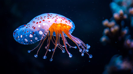 A vibrant spotted jellyfish drifts gracefully in the deep blue sea, its bioluminescent glow illuminating the dark water. The jellyfish has a translucent bell with red spots.