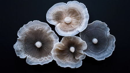A close-up view of four distinct mushrooms, each featuring a unique blend of white and brown tones, with a prominent white core at its center, set against a dark, contrasting background.