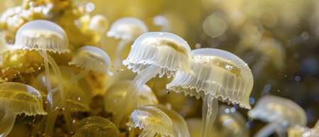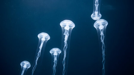 A group of jellyfish swimming in a blue ocean with green water, AI