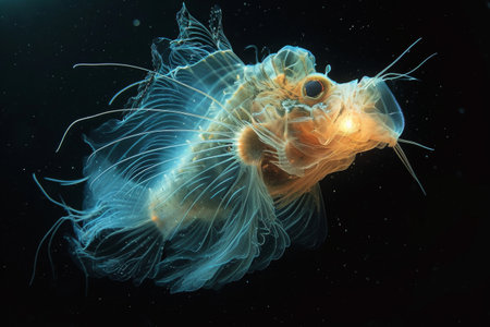 A detailed view of a jellyfish floating in the water, showcasing its delicate tentacles and transparent body, A deep-sea anglerfish luring prey with its bioluminescent organ, AI Generated