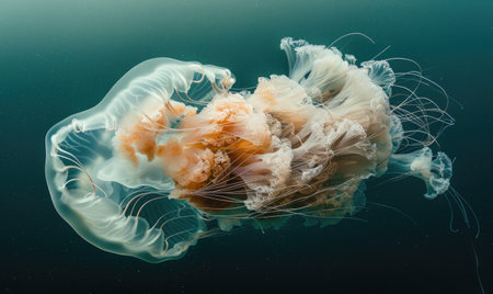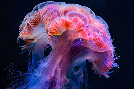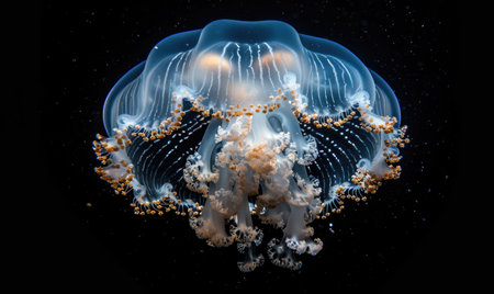 Jellyfish swimming through the dark ocean, its glowing body captured in ultra-high-definition, surreal and captivating light