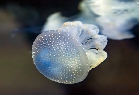 Marble jellyfish, Lychnorhiza lucerna jellyfish drifting gracefully in deep blue water of aquarium. Animal, aquatic organism, underwater life, biodiversity