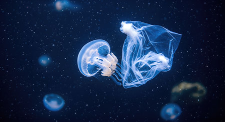 Jellyfish gliding through deep ocean waters, caught in plastic debris, symbolizes the critical environmental challenge of marine pollution affecting ecosystems and wildlife