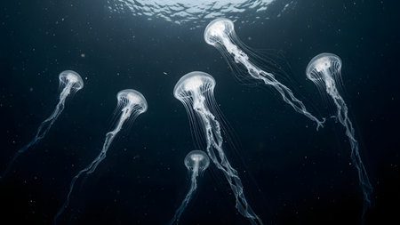 A graceful swarm of jellyfish swimming upwards in the deep blue ocean. Their translucent bodies and trailing tentacles are illuminated against the dark water, showcasing the ethereal beauty of marine life.