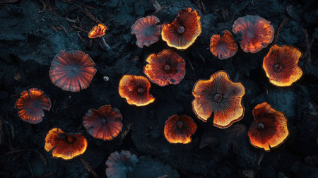 A captivating view of glowing mushrooms emerging from a dark forest floor, showcasing the intricate patterns and colors of fungi in nature.