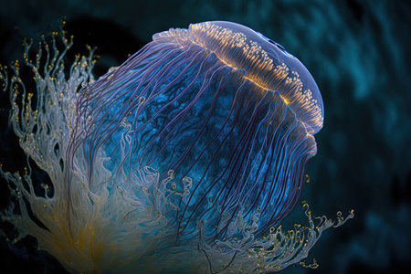An AI generated illustration of a bright blue jellyfish floating in a tranquil underwater environment
