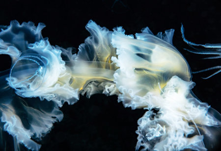 Group of Sanderia Malayensis, Amakusa Jellyfish swimming in aquarium pool with blue neon light. Theriology, biodiversity, undersea life, aquatic organism