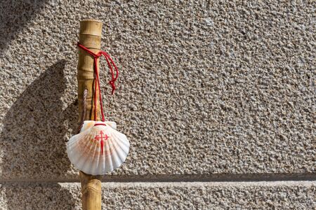 Walking stick and seashell of the Camino de Santiago leaning on granite stone wall. Santiago de Compostela pilgrimage concept. Copy space