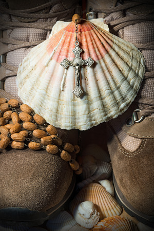 Scallop shell with a wooden rosary beads with a silver crucifix over a pair of hiking boots. Symbols of the Christian pilgrimage