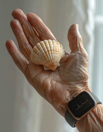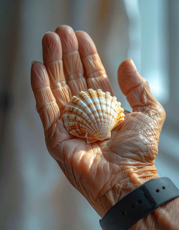 In the gentle light of a quiet afternoon, an elderly hand, etched with the stories of a lifetime, cradles a delicate seashell.