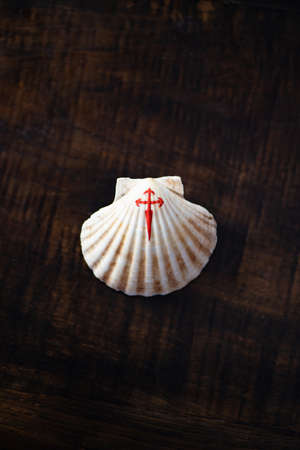 Shell with a painted red cross, symbol of the pilgrim, on a vintage wooden table