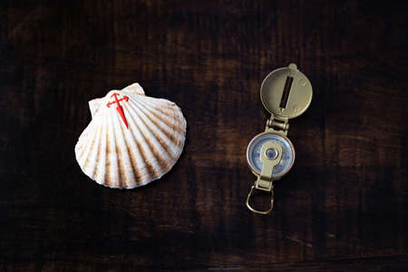 Shell with a painted red cross, the pilgrim symbol and a golden compass, on a vintage dark wooden background