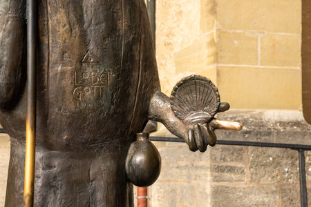Bronze statue of Saint James the pilgrim in front of historic St. James’s Church in Rothenburg ob der Tauber, Bavaria, Germany, symbolizing pilgrimage heritage and medieval culture