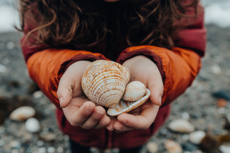 Cupped hands present a treasure trove of various seashells. Hands cradle the oceans secrets, a shell at a time.