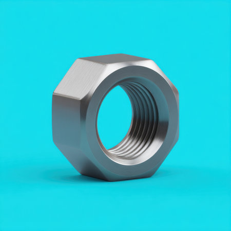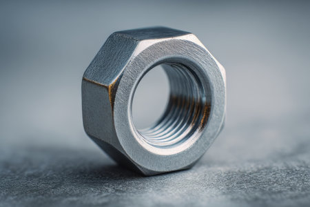 This close-up image features a metallic nut reflecting light with a glow effect in the background. The intricate details and textures are highlighted, making it ideal for industrial themes.