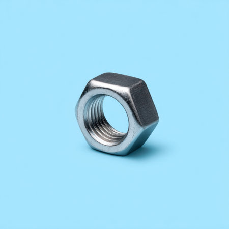 A sharp close-up image of a silver hex nut resting on a light blue background, showcasing its detailed design and industrial functionality. Perfect for mechanical themes.