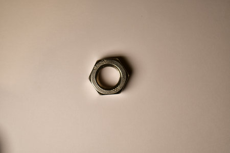This image features a close-up view of a metallic hex nut on a pastel pink background, highlighting its shape and shiny surface for a clean, modern aesthetic.