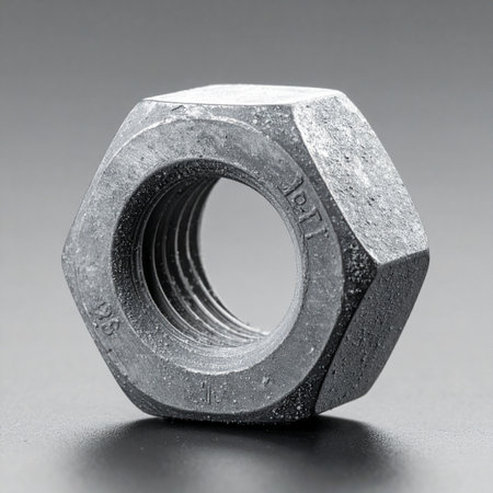 A detailed macro photograph of a single, heavy-duty steel hex nut, isolated on a smooth gray background.
