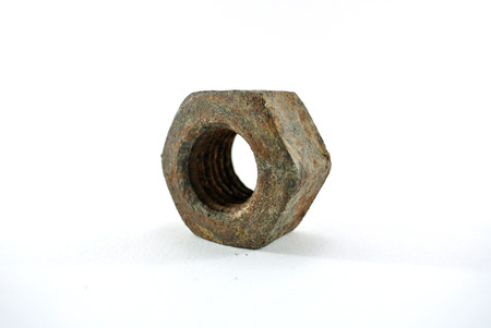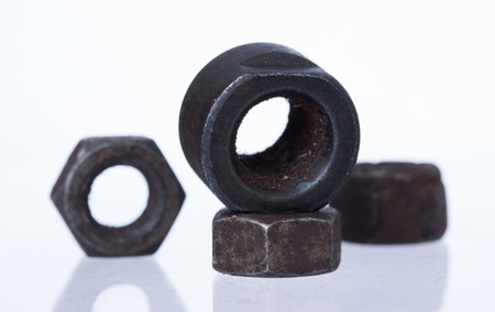 Rusted older metal nuts over white background