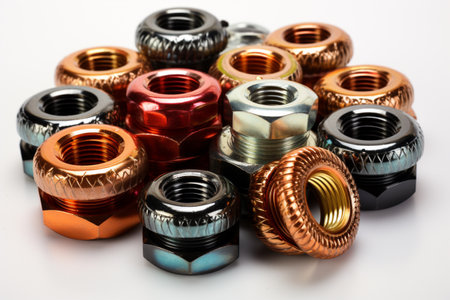 A vibrant display of various nuts, showcasing different materials and finishes, shines under soft lighting for a visually appealing look.