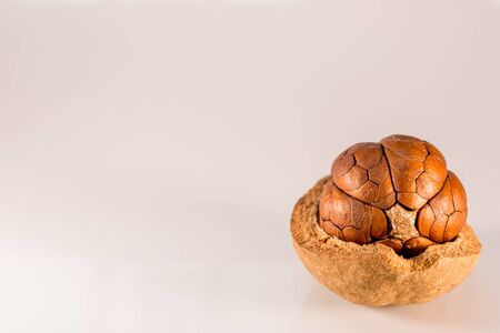 A close-up of an opened pecan nut showcases its rich texture and color against a smooth, homogeneous background. Ideal for highlighting healthy eating or culinary uses. Space available for text.