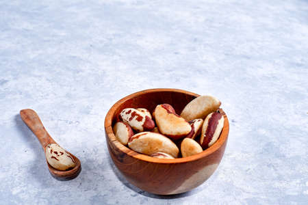 Healthy Brazil nut in a wooden bowl on a blue