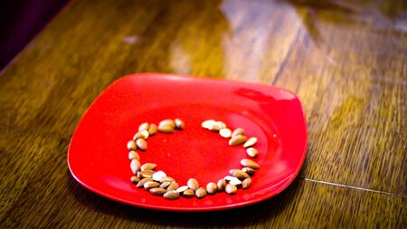 Fried almond grains are placed on a red plate in the form of an unfinished circle. The plate stands on a wooden table.