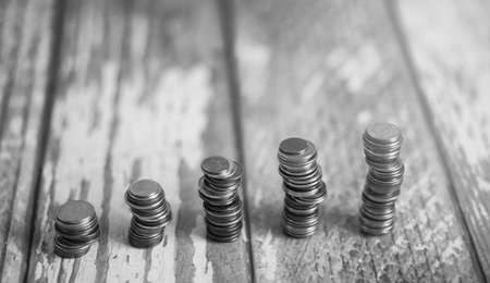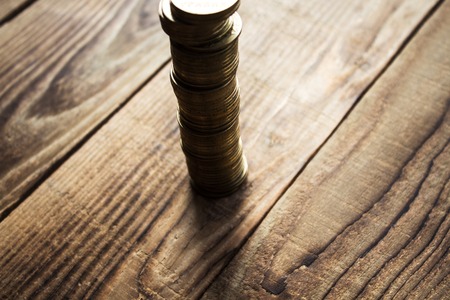 Metal coins are stacked on a wooden tabletop, set against a dark backdrop.