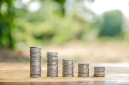 Coins money stack in finance treasury deposit bank account saving, corporate business economy and financial growth by investment in valuable asset to gain cash revenue. Forex trading economy.
