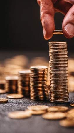 A focused image of an individual inserting a coin into a growing stack, symbolizing savings and financial growth,.