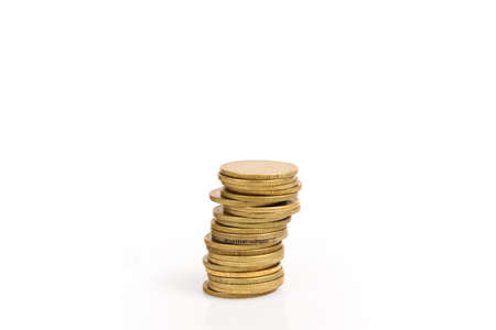 Money and Financial Concept. Closeup of stack and pile of gold coins on white background.