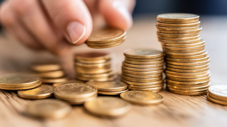 A hand carefully places a coin on top of a tower of stacks. Surrounding coins create a scene of growing wealth on a rich wooden surface in soft, warm lighting..