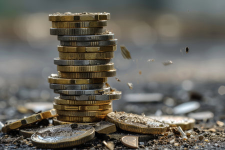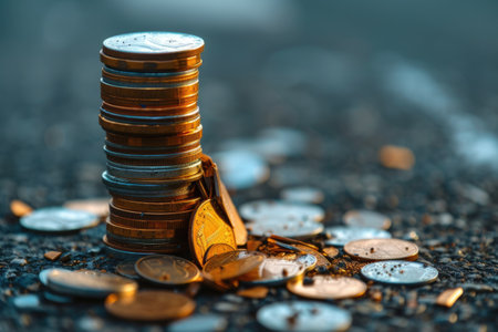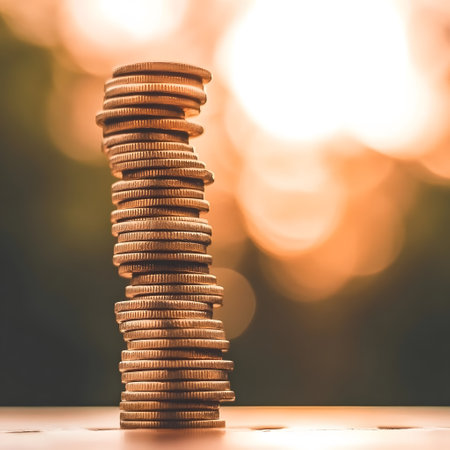 Stacked coins reflecting sunlight in a serene outdoor setting during the golden hour of the evening