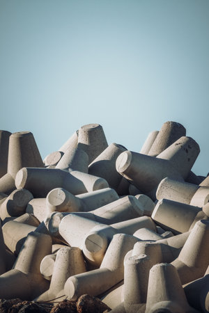 Cement tetrapod breakwater on pier stones with a painted inscription on them for protection of embankment from high tides and storms; shallow depth of field, dusk