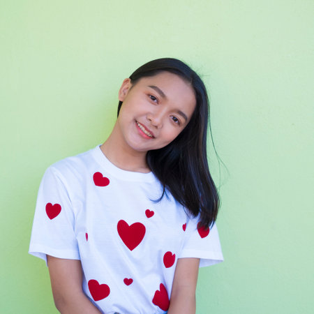 Beautiful young girl wear red heart shirt on green background.
