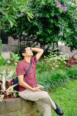 Young Asian man relaxing in the streets outdoors