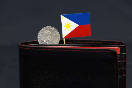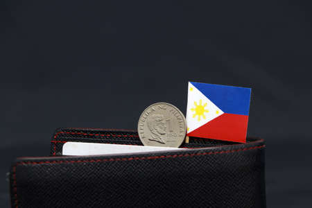 One coin of Philippine peso money and mini Philippine flag stick on the black wallet with dark background. Concept of finance or currency.