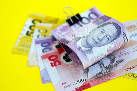 Philippines peso money bills in big amount close up on yellow. Finance and banking concept