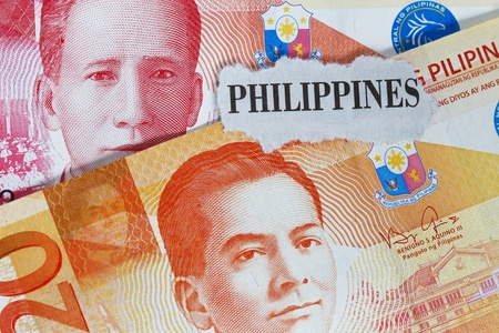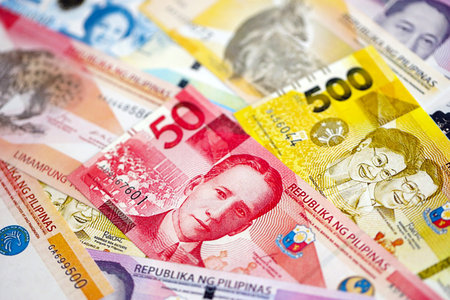 Philippines peso currency money bills. The current banknotes lies on table in big amount close up