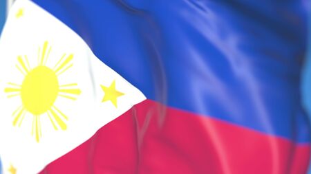 Flying national flag of the philippines at Rizal, Luneta Park in Manila, Philippines, isolated against a light blue sky.