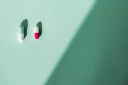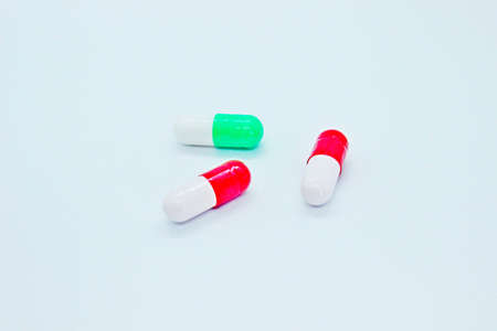 Selective focus on pink-white capsule pill fall down to white table. Antibiotic drug use with reasonable. Antibiotic drug resistance. Pharmaceutical industry. Antimicrobial drug market.