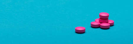 Bright pink pills on dark blue coloured background. Medication and prescription pills web banner with copy space.