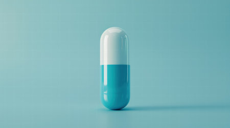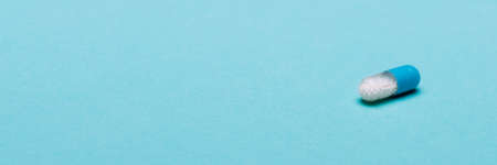 Single medication capsule on blue pastel coloured background. Medication and prescription pills web banner with copy space.