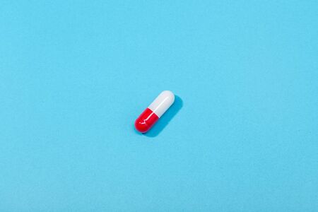 Medical pill capsule isolated on blue background. Medicine, healthcare or pharmacy concept