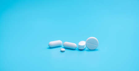 Round white tablets pills on blue background. Tablets and caplets pills pharmaceutical dosage form. Pharmacy and health topics background. Pharmaceutical industry banner. Online pharmacy store banner.