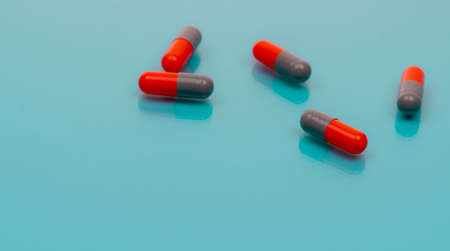 Gray-orange antibiotic capsules pill spread on blue background. Pharmacy banner. Prescription drug. Antibiotic drug resistance. Pharmaceutical industry. Healthcare and medicine. Antimicrobial drugs.