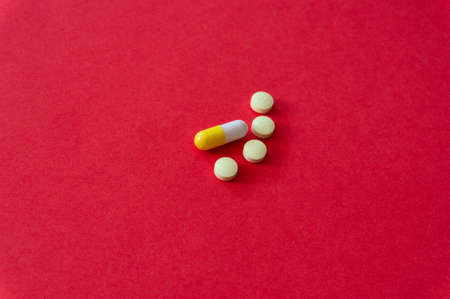 Medications and pills on a red background.