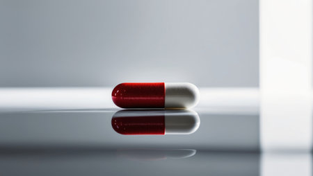 AI Generated. Red and white capsule pill with granules on reflective surface
