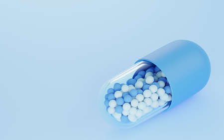 Capsule with particles inside with blue background, 3d rendering. Computer digital drawing.